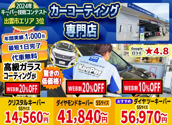 私達キーパープロショップは、島根・出雲市・雲南市エリアのカーコーティング専門店として、日本ダントツのカーコーティングブランド、キーパーの正規代理店として認定を受けております!